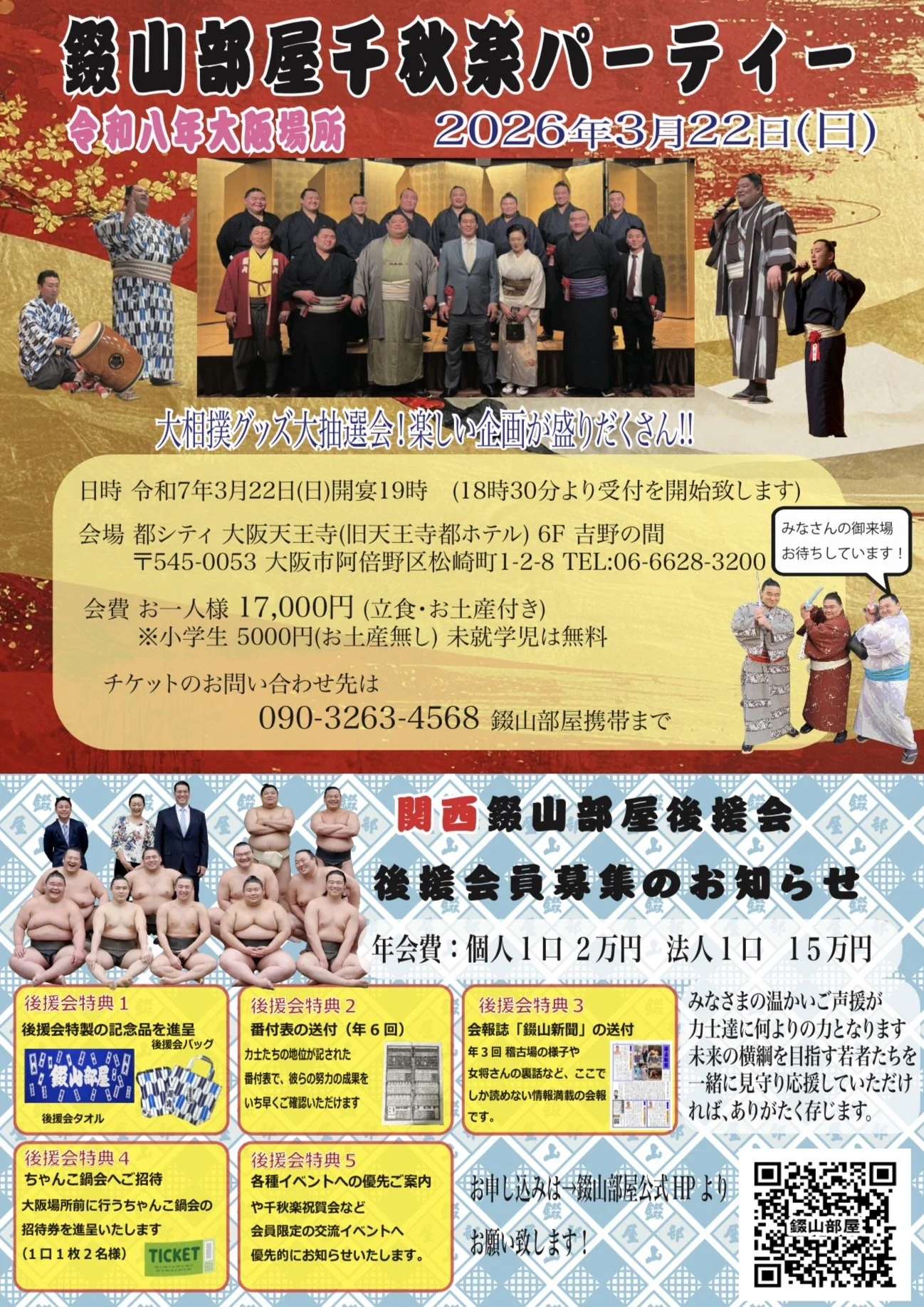 この度、錣山部屋の活動支援および関西地方における相撲文化の振興を目的として、「錣山部屋 関西後援会」を設立いたしました。